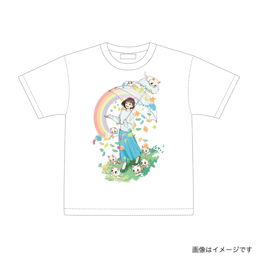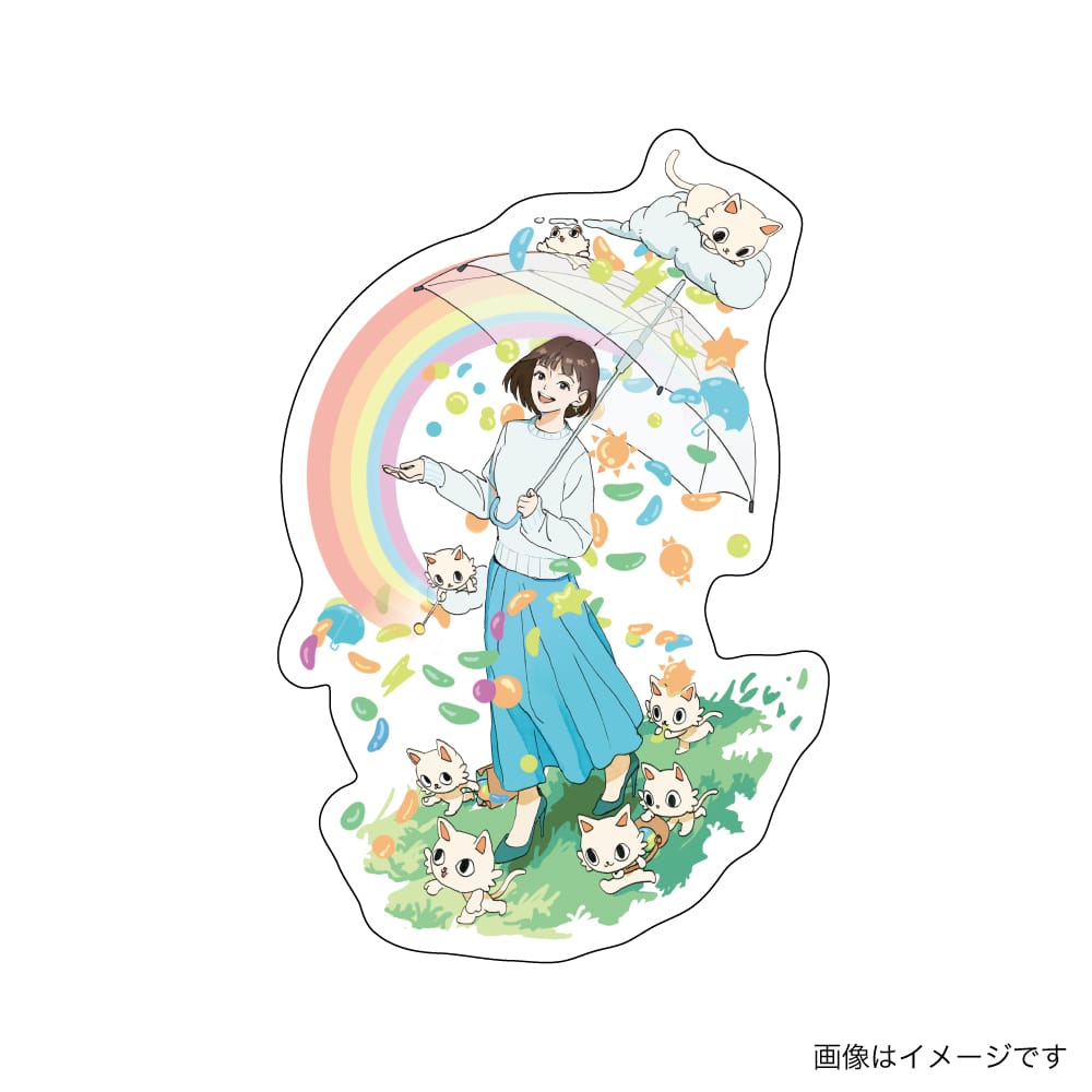 アーティスト・ゆうき さんが描く、リアルとファンタジーが溶け合う世界で、大好きなグミが雨のように降る幻想的な空模様を表現しました。
