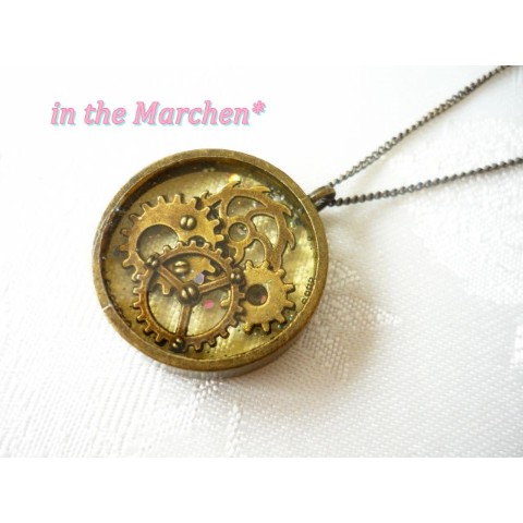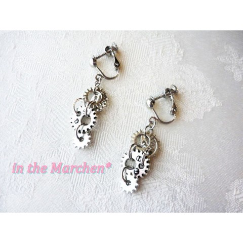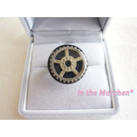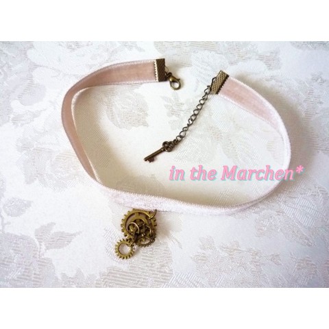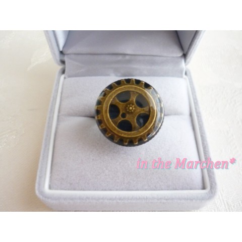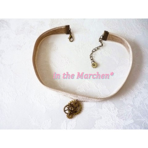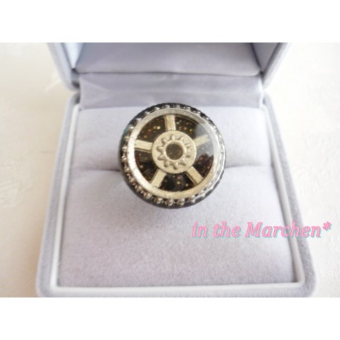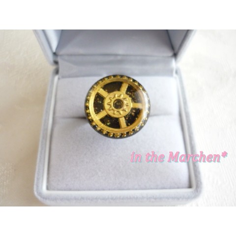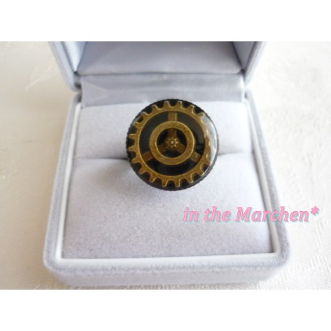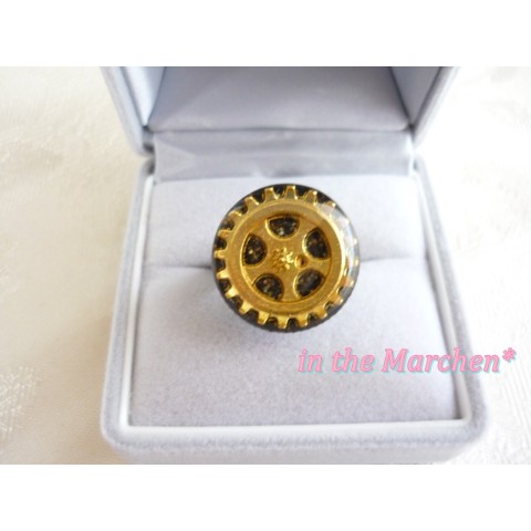 アンティークゴールドの大中小の歯車を半立体的に組み合わせ、両面ベロアリボンに。