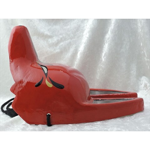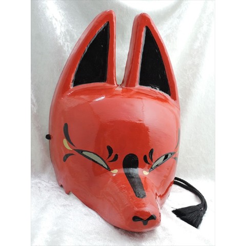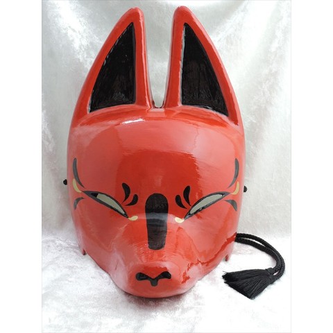 赤地に黒と金をあしらった狐面です。赤は古来より鳥居等にも使われており魔を祓う色とされます。深い紅の中に力強さと麗しさを併せ持ったデザインです。