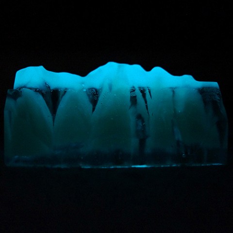 “MINE"の山並みの頂上部分にはアルプス山脈のような残雪を表現しています。日中の光を溜め込んで暗くなると青白く発光します。それはまるで夜の月光に反射して光り輝く残雪のようで幻想的です。