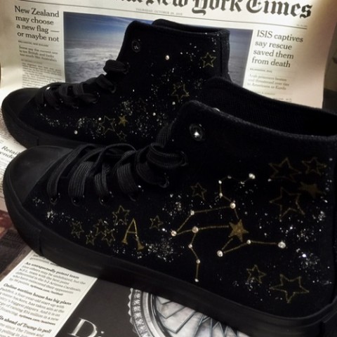 今回は、ゴールドのキラキラと輝く塗料を用い、数多の星ーをすべて手描きで施しました。それらに加え、細かいラメと、スワロフスキー級ストーンをふんだんに用い、世界に一つだけの豪華な一足が完成。