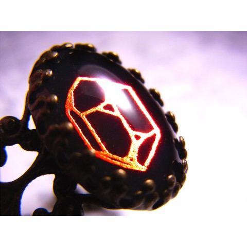 赤で箔押しした水晶の結晶図をガラスカボションにしてリングを作りました。