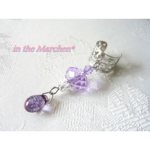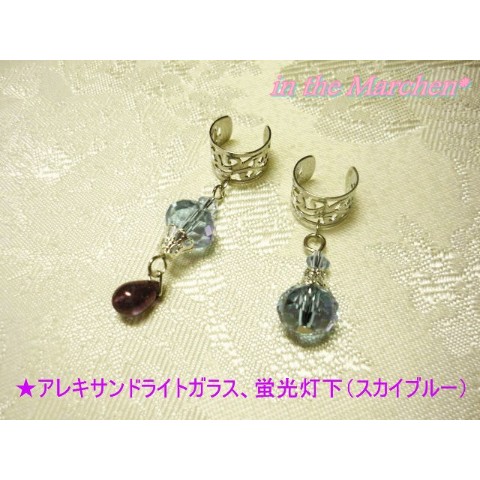 静かにきらめく白銀の透かし模様の入ったイヤーカフに、怪しく不可解な色変化を起こすカッティングされたアレキサンドライトガラスを大小一粒ずつ。