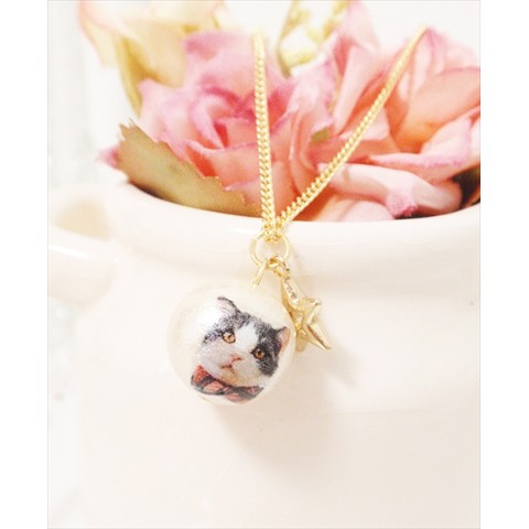 【SNOW BABY LOVE】リボンねこコットンパールネックレス★ゴールド星MIX