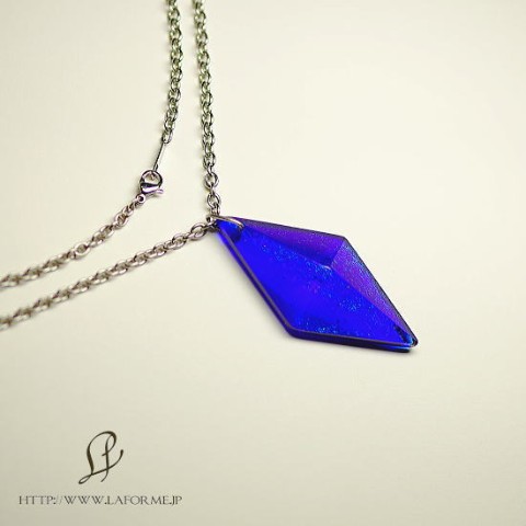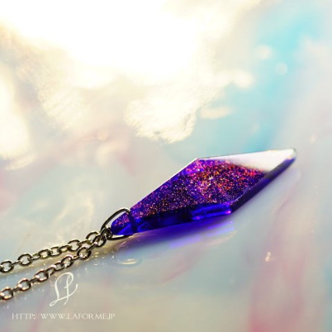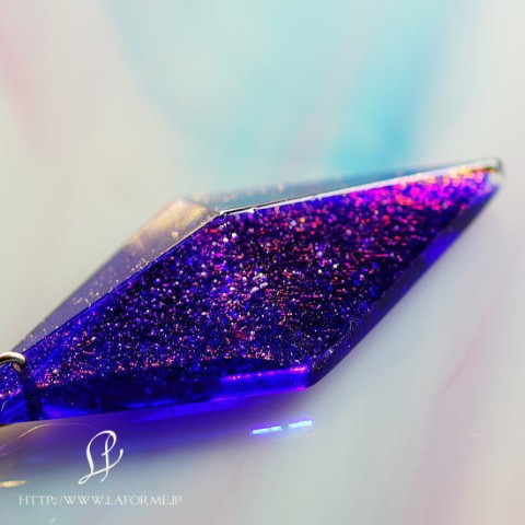 コバルトブルーをベースに、見る角度や光の当たり方で表情を変える美しいラメを施しています。暗闇では神秘的で優しい光を放ちます。高級輸入素材ガラスを使用し丁寧にお作りしたラフォルムオリジナルのガラスペンダント。ステンレス製チェーンと共に、高級感のある仕上がりです。
