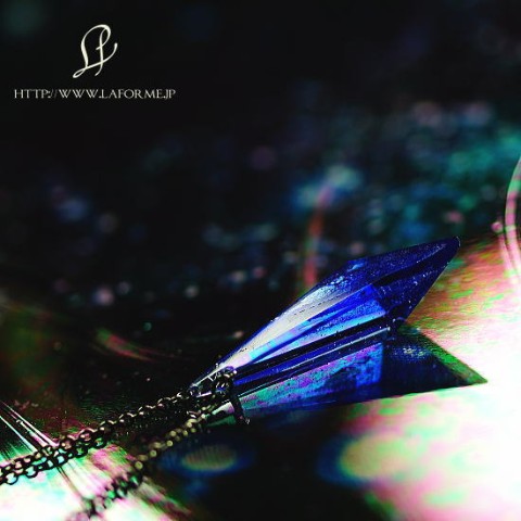 ライトスカイブルーをベースに、シャープで細身のフォルムに仕上げています。表裏同じカットは手作業で丁寧に磨きを行っております。内部には繊細なラメと蓄光加工を施しております。オリジナリティのある世界にひとつの素敵なペンダントです。