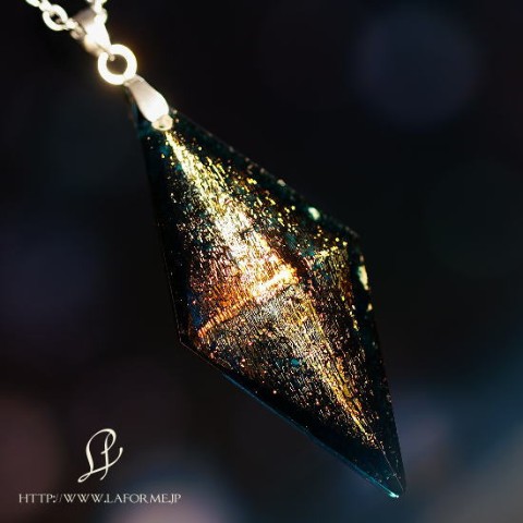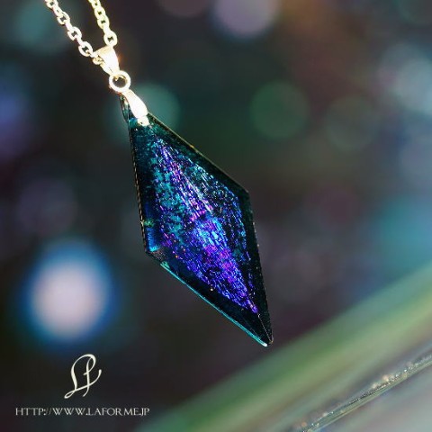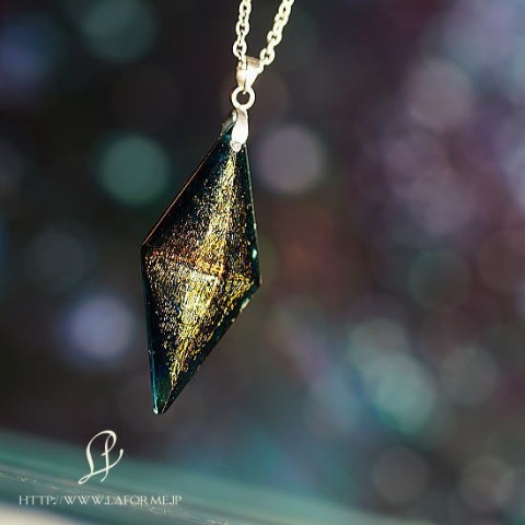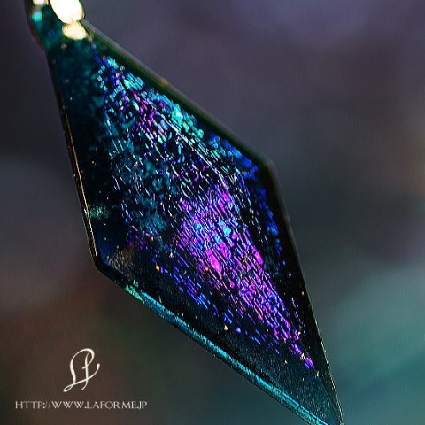 表裏面内部にそれぞれ別々の煌きを持つラメを施した、印象的なガラスの八面体ペンダント