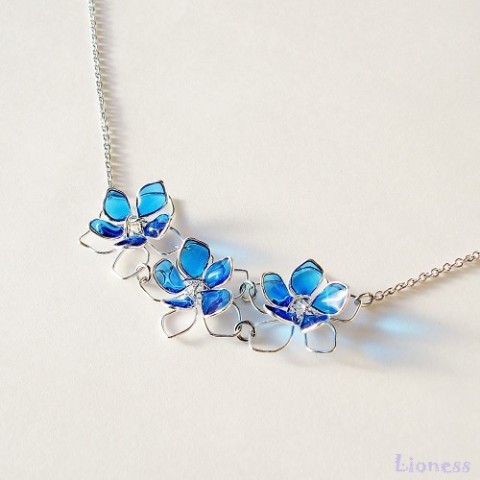 小さな青い華を3つ摘んできたネックレスです。つけ心地はとても軽く、負担がありません。
