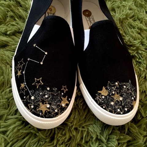 北斗七星やゴールドスターは、すべて手描き。世界に一つだけの、オリジナルスリッポンが完成いたします。大切なあの人に贈り物として、またペアシューズとしてもいかがでしょうか?