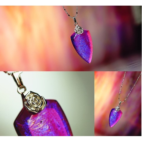 チャーミングで素敵な色合いの赤系ピンクをベースにした細身のエンブレムタイプペンダントです。内部には、思わずはっとするような美しいダイクロ偏光ガラスの煌きと、それを包み込むようなレインボーラメを品良く施しています。太陽光などの光の下でぜひご覧いただきたい煌きです。ジョイント部分は可愛らしいバラのチャーム付きで、細身のチェーンも女性らしさをアップしてくれそう。素敵な貴女にぜひ身に着けていただきたい素敵なペンダントに仕上がりました。
