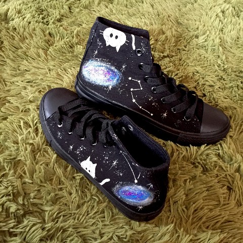 宇宙柄や星座、シルバーの猫は、すべて手描き。世界に一つだけの、オリジナルシューズが完成いたします。大切なあの人に贈り物として、またペアシューズとしてもいかがでしょうか?