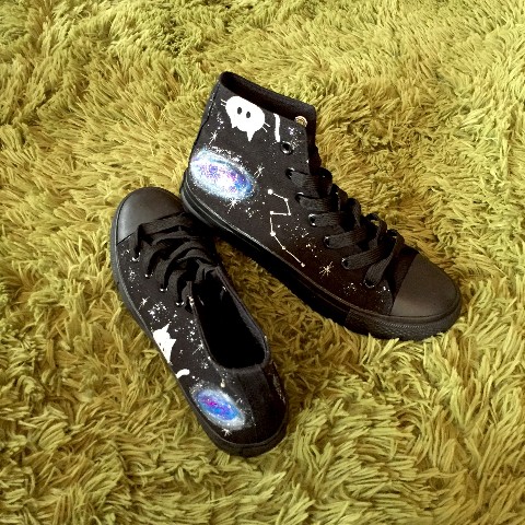宇宙柄や星座、シルバーの猫は、すべて手描き。世界に一つだけの、オリジナルシューズが完成いたします。大切なあの人に贈り物として、またペアシューズとしてもいかがでしょうか?