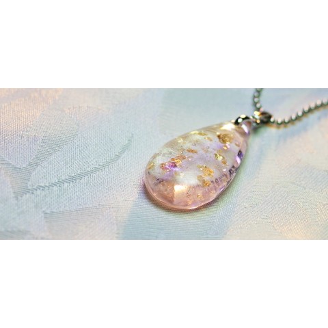 淡い薄紅色をベースに金箔をふんだんに散りばめた美しいドロップタイプペンダントです。さらに内部には光を吸収する度にホタルの光のように神秘的なグリーンの光を放つ蓄光加工を強めに施しています。優しいイメージのネックレスです。