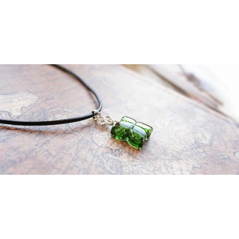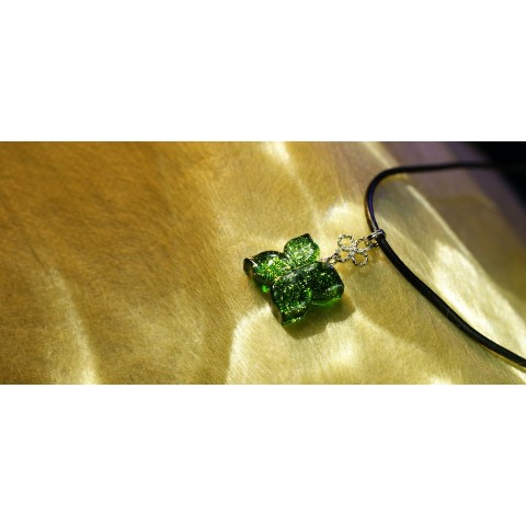 キラキラとグリーンに輝く幸せいっぱいの四葉のモダンなネックレスです。クリアーの硝子で包み込んでいますので、つややかで輝きも美しいです。四葉のチャームも可愛らしく胸元を飾ってくれます。