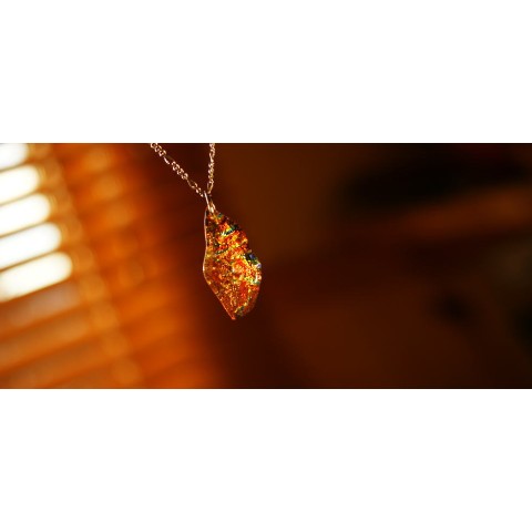 まさに天国や宇宙のような神秘的でミステリアスな雰囲気の不定形フォルムのネックレスです。内部にはブラックをベースにしたダイクロ偏光ガラスを使用しておりますので、強い存在感の煌きをお楽しみいただけます。