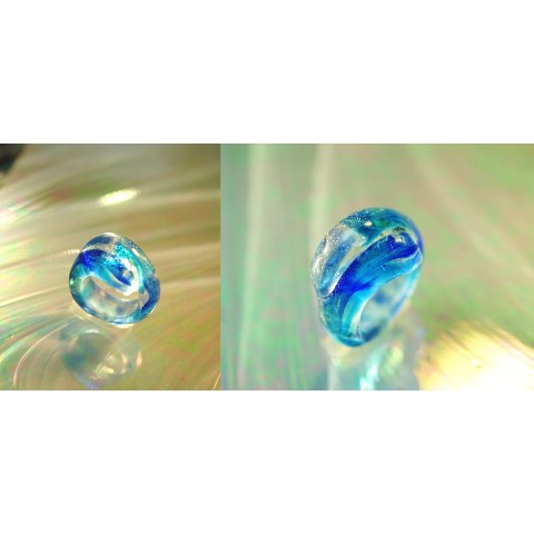 ブルー系をマーブルデザインにした、素敵なリングです。トップ部分で重なっているようなデザインです。優しいゴールドのラメが輝き、暗いところでは光を吸収する度にターコイスブルーにホタルのような神秘的な光を放つ蓄光加工を施しています。