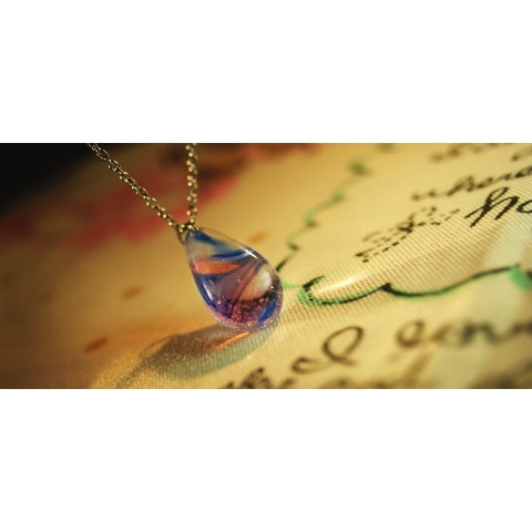 クリアーにピンク系、ブルー系ホワイト系を使用してマーブルデザインにいたしました。光を吸収する度にホタルのような神秘的な光を放つターコイズブルーの蓄光加工を施しました。身に着け易い、可愛らしいドロップタイプのネックレスです。