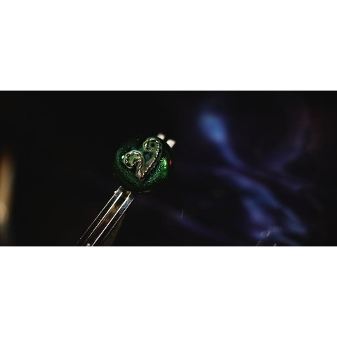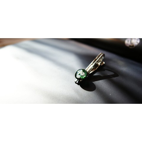 内部に純銀糸でアイビーのような幾何学模様を封入しています。ベースは細かく美しく煌くグリーン系のラメを施しました。神秘的で美しいネクタイピンです。