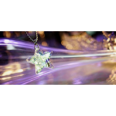 透明の星は、見る角度や光の入り方で全く色合いが変わるダイクロ偏光ガラスを全体に施しました。見る角度によって、色合いが全く変わって偏光します。内部には、純銀の星が7つ施してあります。美しくすばらしい、輝きある星タイプのネックレスです。