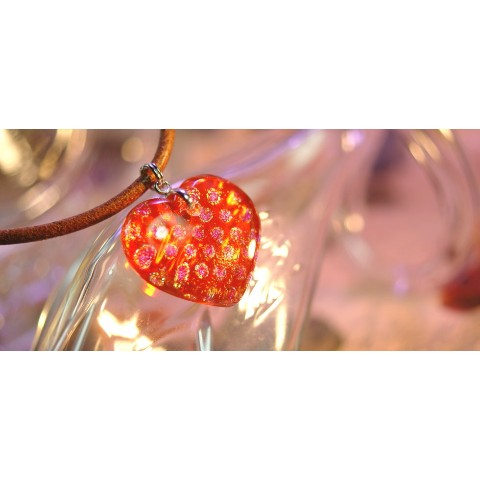 寄せられたデザインコンペの『Jewelheart』を実際のネックレスにお作りいたしました。オレンジをベースに、かわいらしい丸いドットのダイクロ偏光ガラスを使用しています。つややかで滑らかな素敵なハートネックレスです。