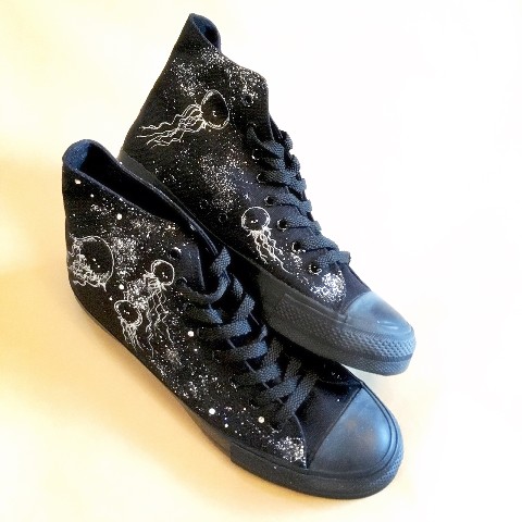 くらげさんは一足一足すべて手描き。世界に一つだけの、オリジナルシューズが完成いたします。大切なあの人に贈り物として、またペアシューズとしてもいかがでしょうか?