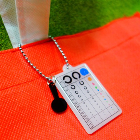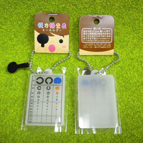 手で持って頂いて腕を軽く伸ばした状態(50cm)離した所で見て頂ければ簡易視力検査が出来ます。