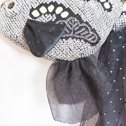 鹿の子絞りを鱗に見立て、チュールの鰭を添えて華やかな金魚に変身しました。