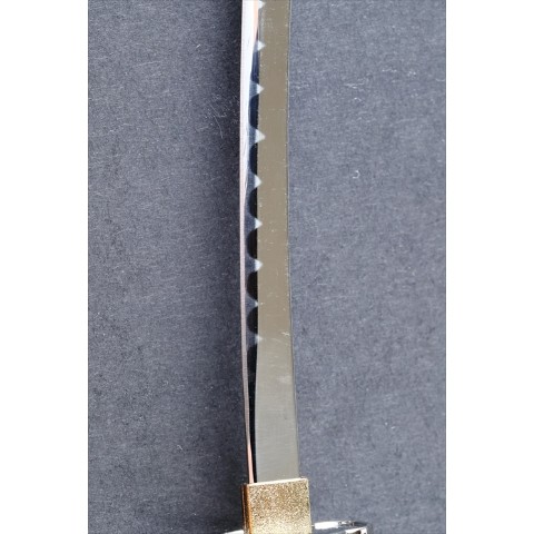 刃体には刃紋が入っており、また、鞘には真田家の六文銭家紋があしらわれております。掛け台付きのため部屋に飾っておけば、抜群のインパクトを持ちます。岐阜県関市の職人により刃付けをしているため、シャープな切れ味となっております。