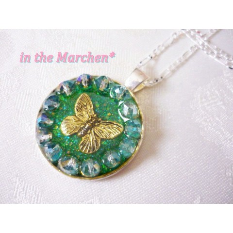【in the Marchen*】結晶化した湖の底の古白銀の蝶(ペンダントネックレス)水翠色