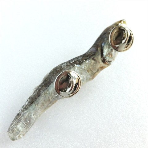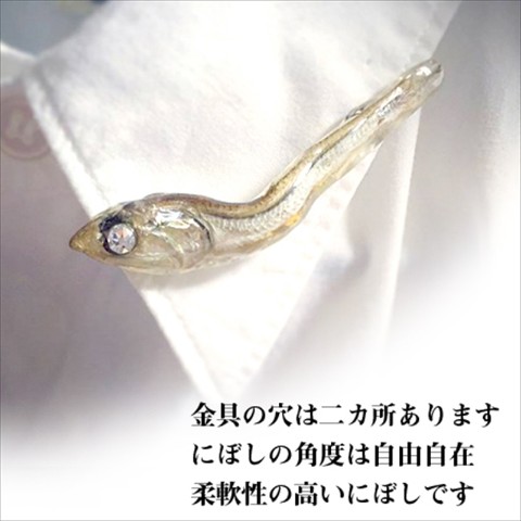 ホンモノのにぼしを樹脂で加工したピンブローチ。どんな向きにも対応する柔軟性の高いにぼしです。