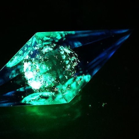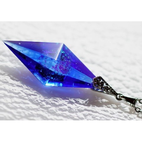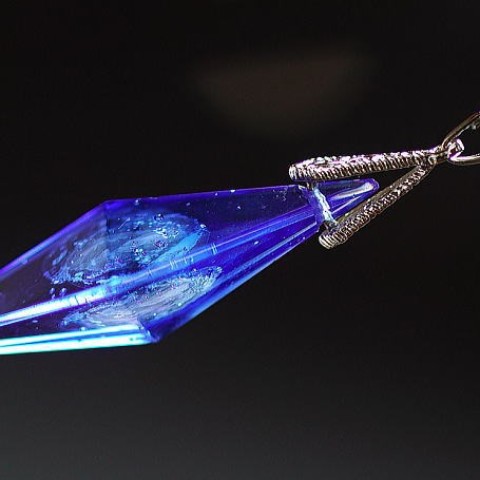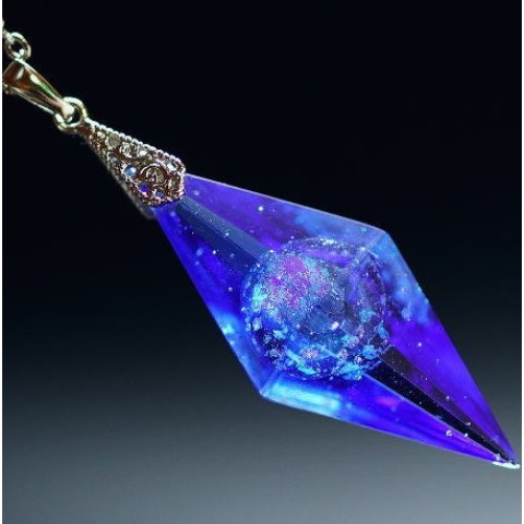 透明感のあるライトスカイブルーをベースにしたスタイリッシュな八面体ペンダント。やや小ぶりの八面体の中央部分には、青い宇宙に浮かぶ惑星の様な球体風のダイクロ偏光ガラスの煌きを施しております。存在感のある世界にひとつのオリジナル作品です。