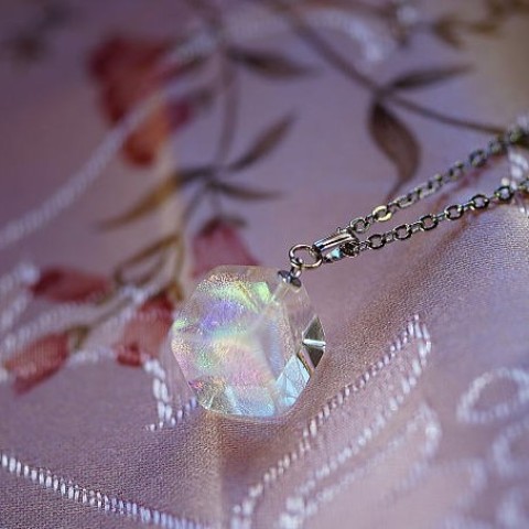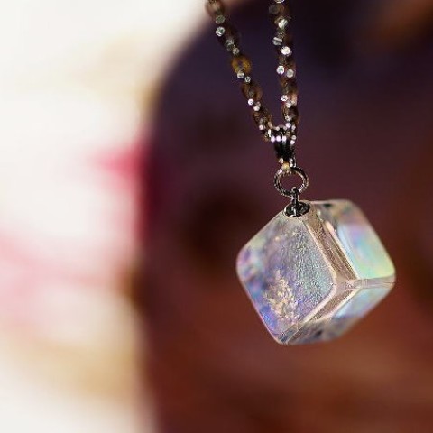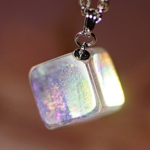 透明感のある氷のキャンディー♪丸みのある可愛いキューブ(立方体)ペンダントです。内部に煌くダイクロ偏光ガラスを柔らかなマーブル模様にしています。見る角度や光の当たり方で様々な表情をお楽しみいただけます。