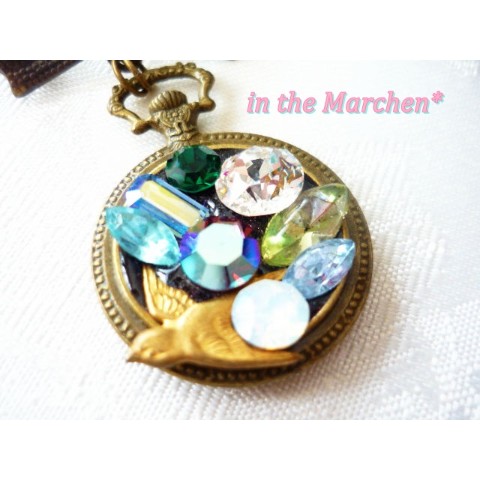 小さな金古美の懐中時計型の中に、夢溢れる大小様々にきらめくクリスタルやヴィンテージガラスを配置した、立体感のある一点もののブローチです。