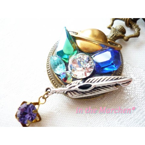 小さな金古美の懐中時計型の中に、夢溢れる大小様々にきらめくクリスタルやヴィンテージガラスを配置した、立体感のある一点もののブローチです。