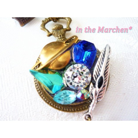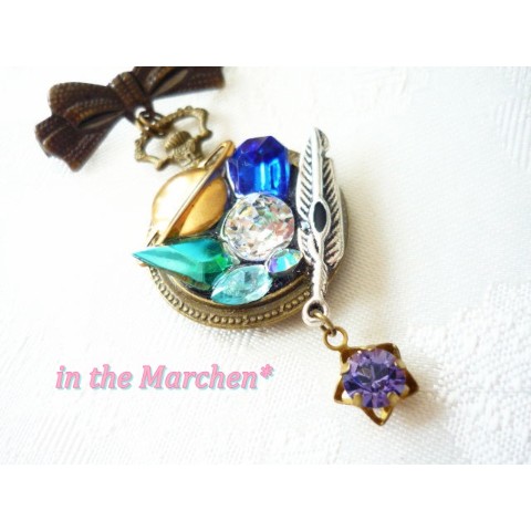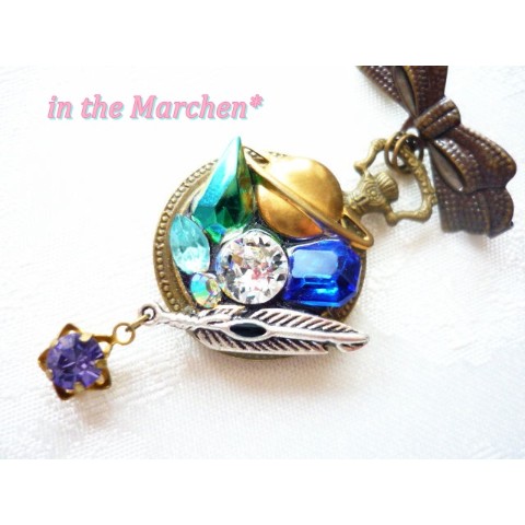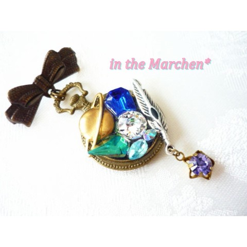 【in the Marchen*】「惑星探索」アンティーク風懐中時計型リボンブローチ 宝石の寄せ盛り細工