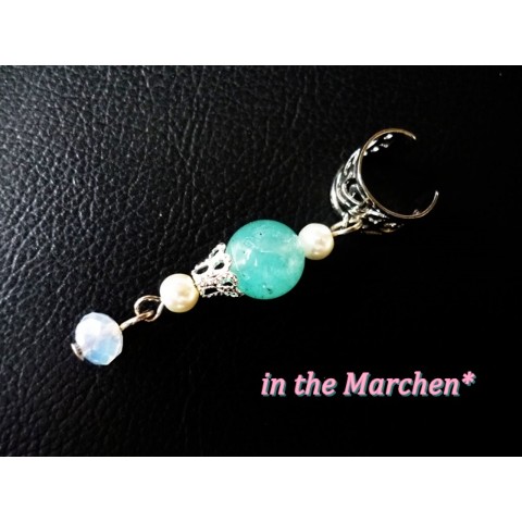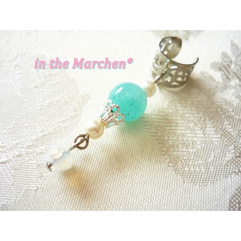 静かにきらめく白銀の透かし模様の入ったイヤーカフに、柔らかい色合いのアマゾナイトと小粒のパールに、乳白色のカットガラスを添えて。