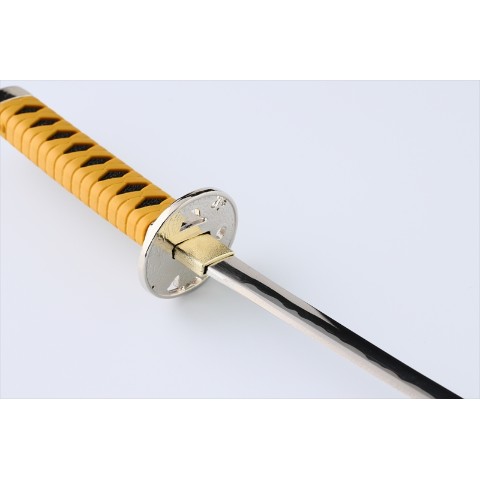 新選組局長・近藤勇の愛刀"長曽祢虎徹"をモチーフにしたペーパーナイフです。鍔や刃紋など細部までこだわっております。刃物の町関市の職人が1本1本丁寧に刃付けをしているため、封筒などを気持ちよく切る事ができます。横掛け台付きのため、使わない時でも見て楽しむことができます。