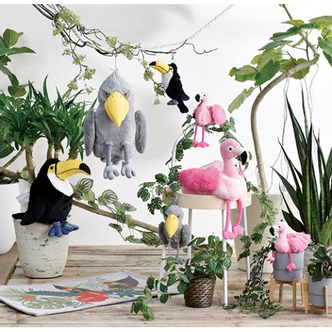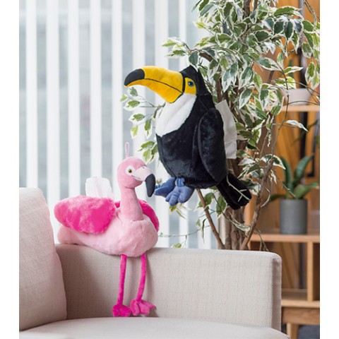 まるで南国のリゾートホテル?!ボタニカルテイストのインテリアにぴったりなふわふわな鳥たちのティッシュケースです。ゆらゆらと足がゆれるのもいいですね。