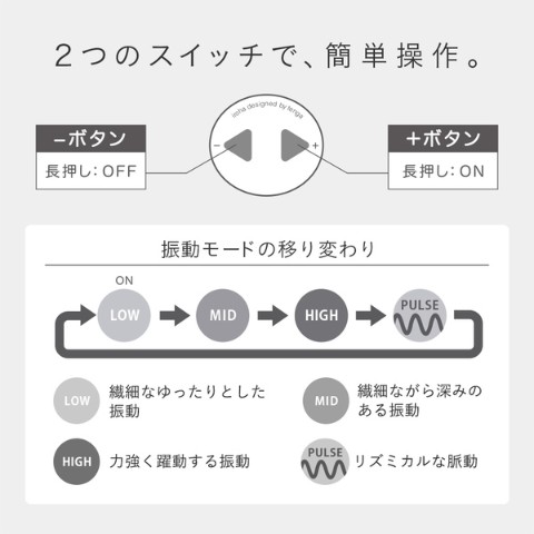 全体をあてがったり、先端部で振動を楽しむことができます。