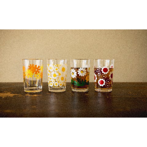 清楚でかわいらしいデザインの「野ばな」は昭和アデリアのヒット商品「アリス」と並んで、当時人気の高かったシリーズです。昭和49(1974)年に贈答用のガラス食器セットとして販売をスタートしました。白い花柄はよく見ると花びらが散っているのもあり、当時のデザイナーの遊び心が感じられます。