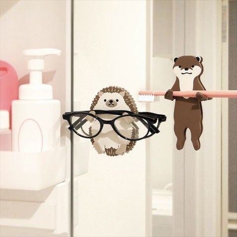 水周りの小物をギュッと抱えて、ピタッと貼り付く吸着式フック!ー 洗面所の鏡や、お風呂場のタイル・ガラスなど、つるつるした場所に簡単に貼り付きます。手足を曲げて歯ブラシ・コップ・ヘアゴム・カミソリ・メガネなど、ごちゃつく小物をかわいく収納!床に接しない壁面収納でぬめり・カビ対策にもおすすめです!