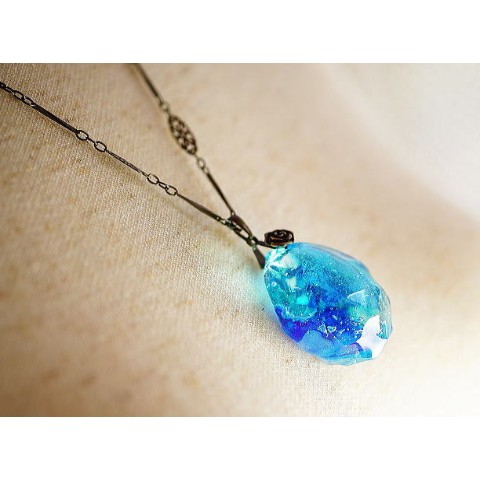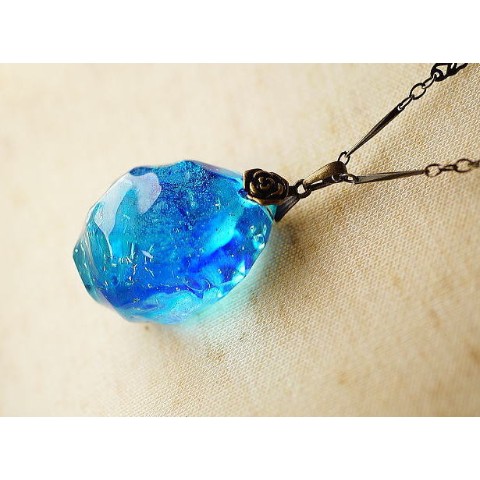 ガラスアクセサリー / コレクション:ネックレス・ペンダント / 191203-124205 / 3588 / アメリカンガラス / 約34×24×18mm / 青緑系青系 イリデセント(ラメ)加工ダイクロ偏光ガラス加工その他の模様加工アイスロック加工蓄光加工 / デザイン甲丸チェーン アンティークゴールド色 50cm / La forme