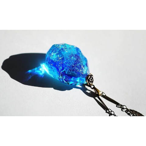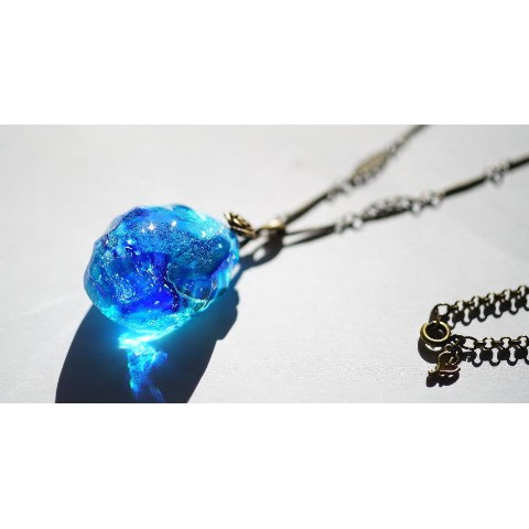 聖水の結晶は大自然からの贈り物。『水の誕生』シリーズの美しい煌きと色彩。ランダムな表面に施したカットとブルー系の濃淡、そして内部の煌きが陽光に照らされて美しく煌きます。暗闇では神秘的な淡い光をお楽しみいただけます。ぜひ様々なシーンでお楽しみいただきたいオリジナルペンダントです。