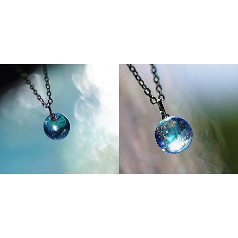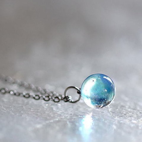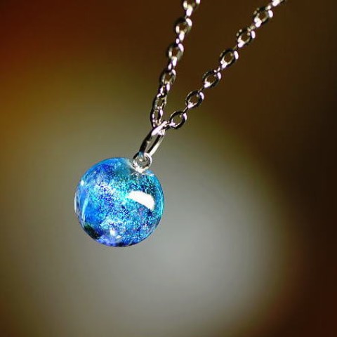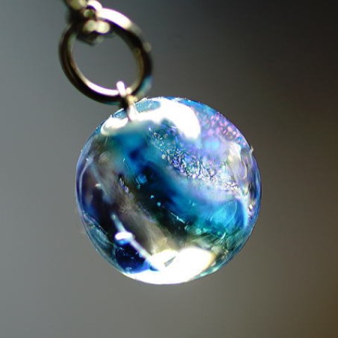 明るいブルー系数種類と、美しい煌きをマーブル模様で再現した透明感のある美しい球体ペンダントです。見る角度や光の当たり方で内部の様々な表情をお楽しみいただけます。ぜひお手に取ってお楽しみください。