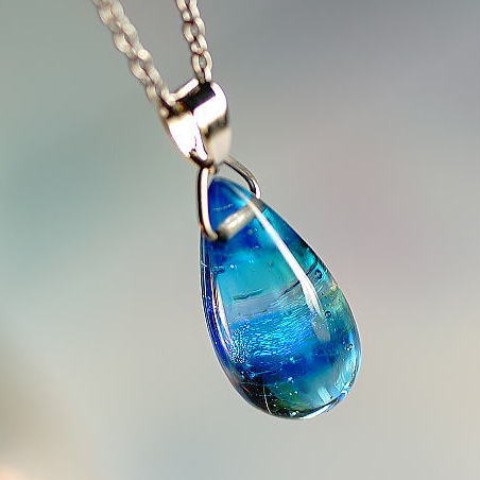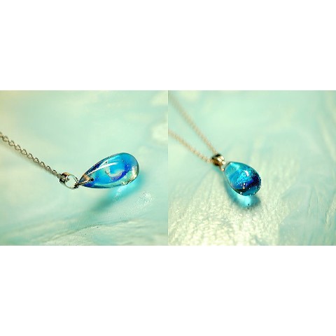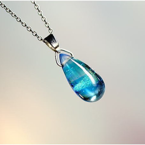 ピュアな天使の涙色。透明感のある美しいアクアマリンブルーやターコイズブルー、ライトスカイブルーの爽やかな色合いに、ダイクロ偏光ガラスの煌きを施して美しいマーブル模様で表現した、透明感溢れる素敵なしずくタイプペンダントです。