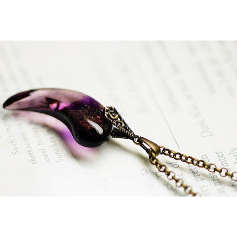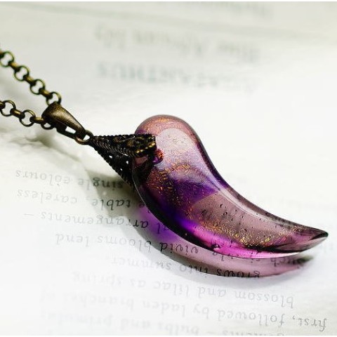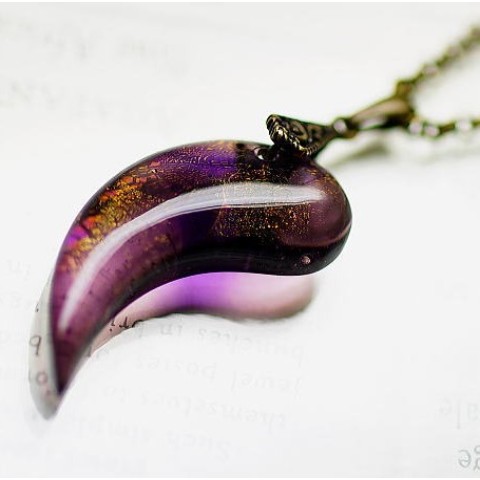 古風と現代風が入り混じった細身の勾玉のようにも見えるスタイリッシュなフォルムのシンプルなペンダントです。美しい紫色に煌きを閉じ込めた素敵な逸品です。アンティークゴールド色の金具パーツと合わせました。