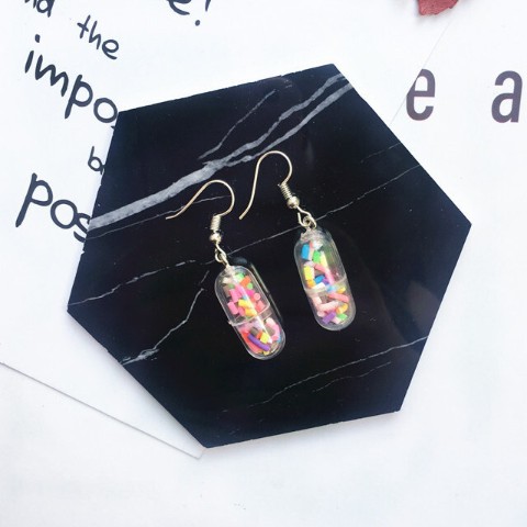 クリアカプセルに入ったキャンディのような粒子のお薬モチーフピアス。