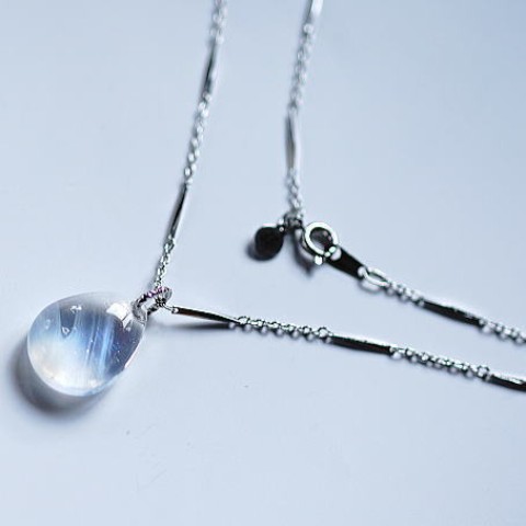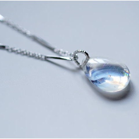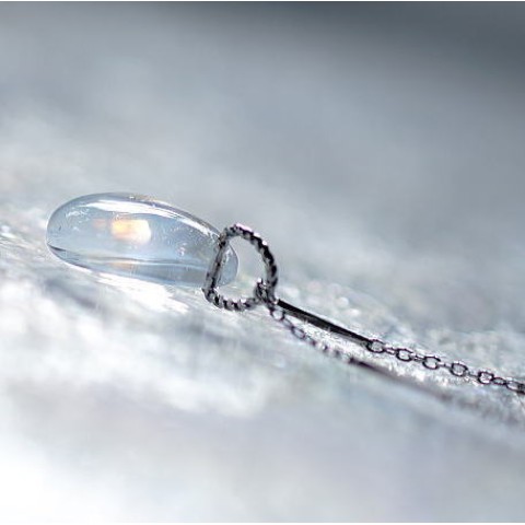 ふんわりとしたヴェールに包まれたように繊細なイメージのドロップタイプペンダント。丸みのあるフォルムと虹色の優しい煌きがとても印象的です。