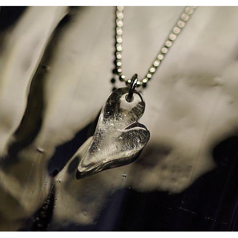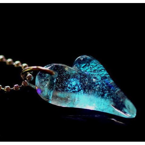 透明なハートの中に粉雪が舞うような可愛らしい変形ハートペンダントが完成いたしました。暗闇では神秘的な蓄光の光をお楽しみいただけます♪