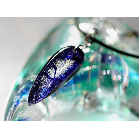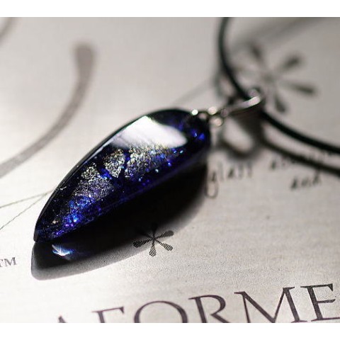 濃紺のアベンチュリンブルーがベースカラー。シンプルなフォルムの中にゴールドラメが煌く、シックな雰囲気のオリジナルペンダントに仕上がりました。ぜひお手に取ってその煌きをお楽しみいただきたい逸品です。